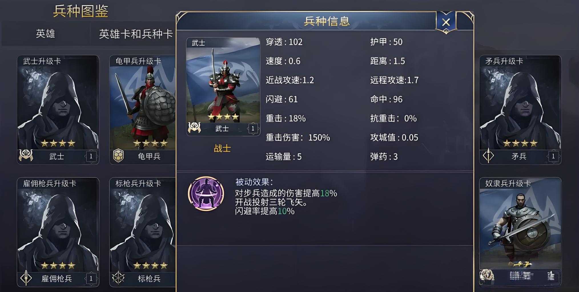 1、武士是合区前最强战士,对步兵伤害提升18%,开战投射三轮飞矢,闪避率增加10%,输出与生存能力均衡适配常规对战。