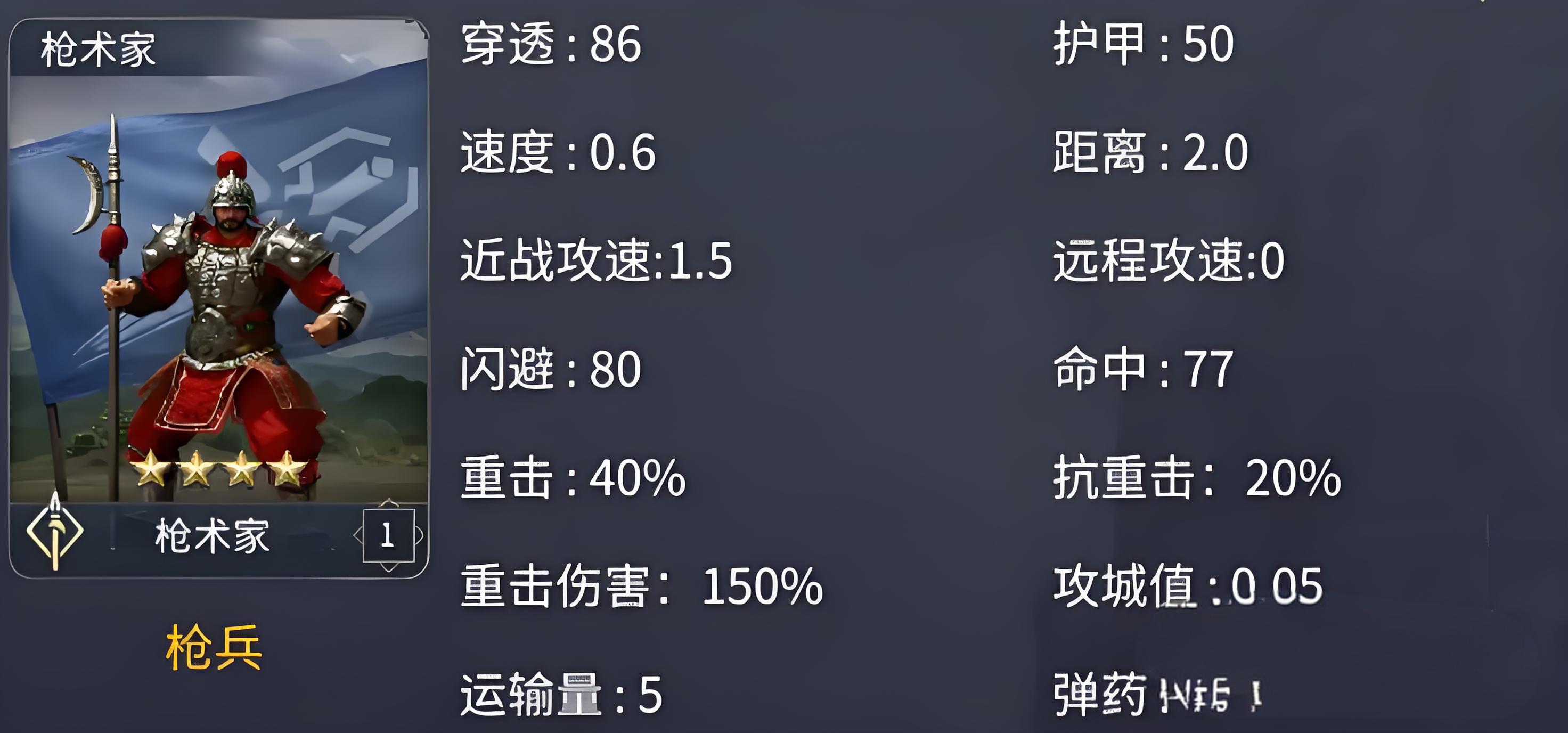 2、雇佣枪兵侧重拆迁与反骑兵,对骑兵伤害提升20%,重击率8%且攻城值高,还能看破隐武者隐身,适配攻城与特定对抗场景。