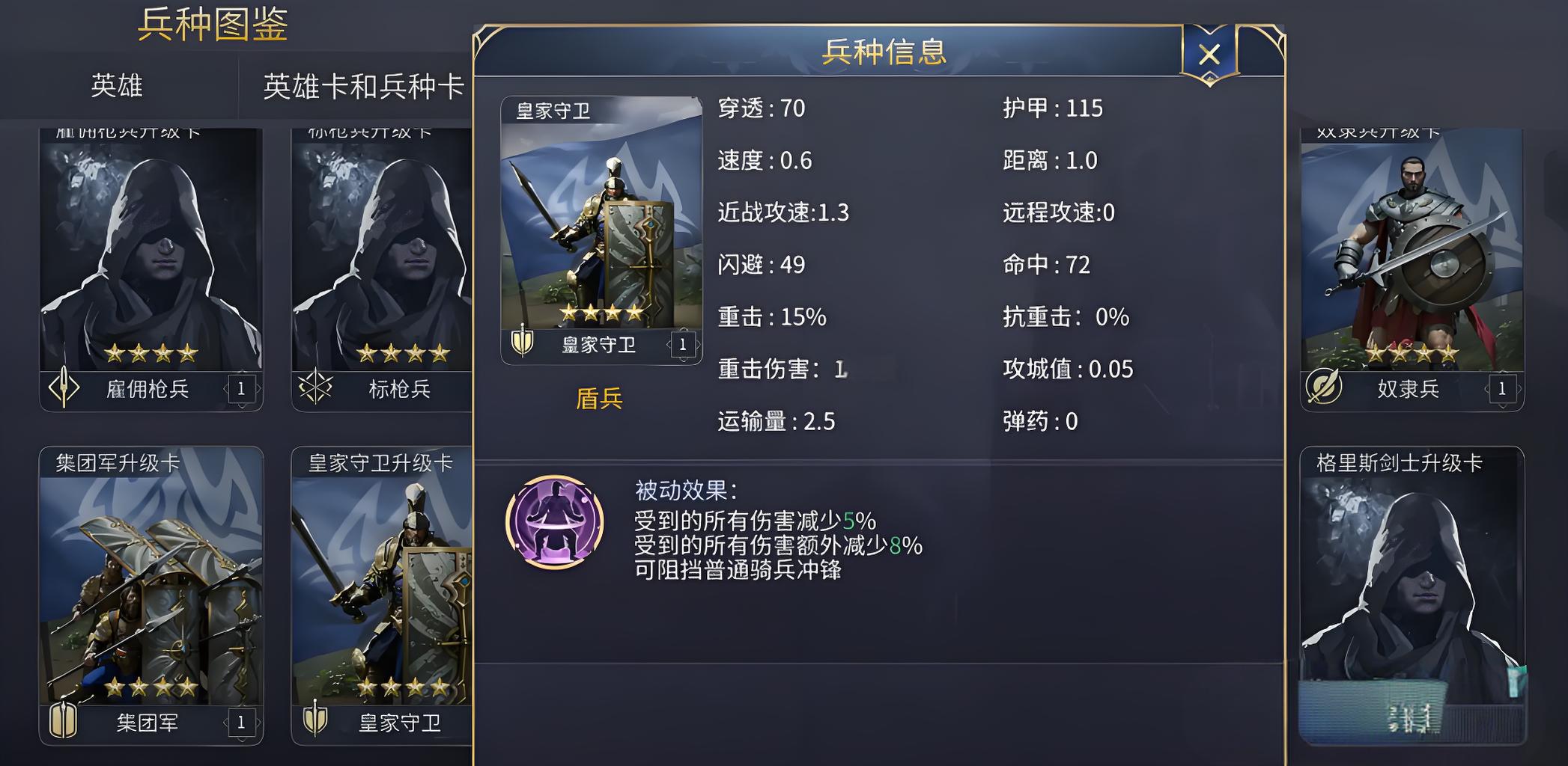 3、皇家守卫作为综合强势盾兵,受伤害可共同减免13%,能阻挡普通骑兵冲锋,属性稳定适配多数对战与地形条件。