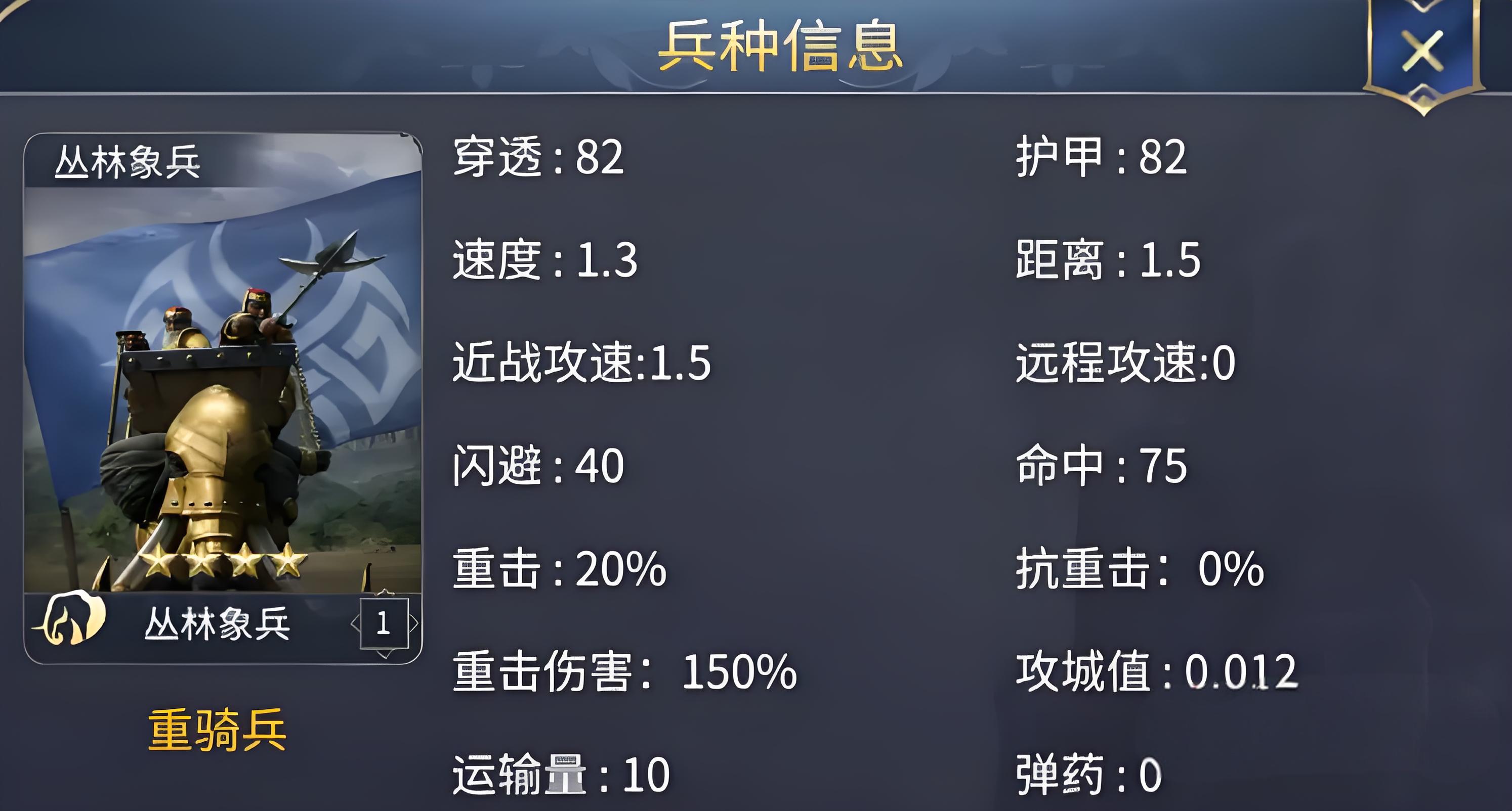 5、丛林象兵属最强重骑兵,对步兵伤害提升6%受伤害减8%,冲锋时穿越目标造成220%伤害,主打爆发突破适配快攻战术。