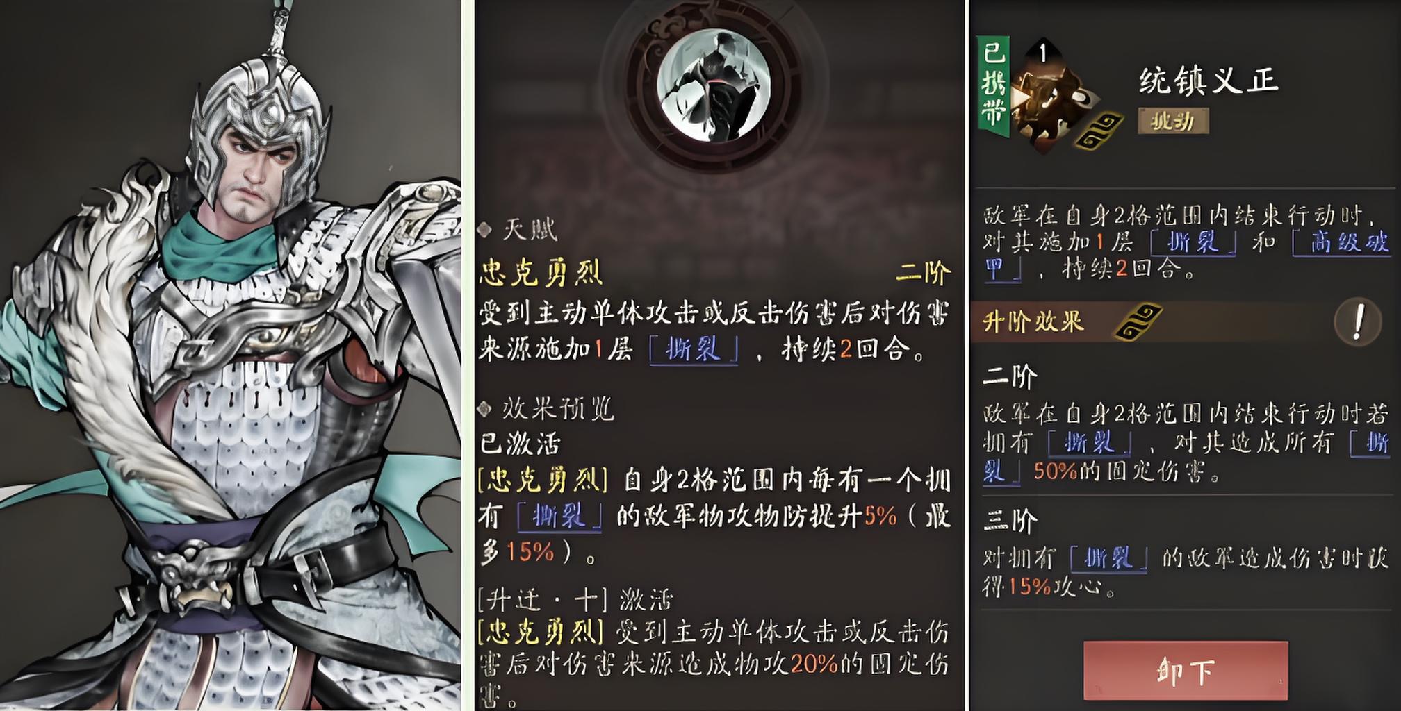 2、天赋忠克勇烈可施加撕裂效果,自身两格内有撕裂敌军时物攻物防提升,升阶后还能获得额外固定伤害与攻心效果。
