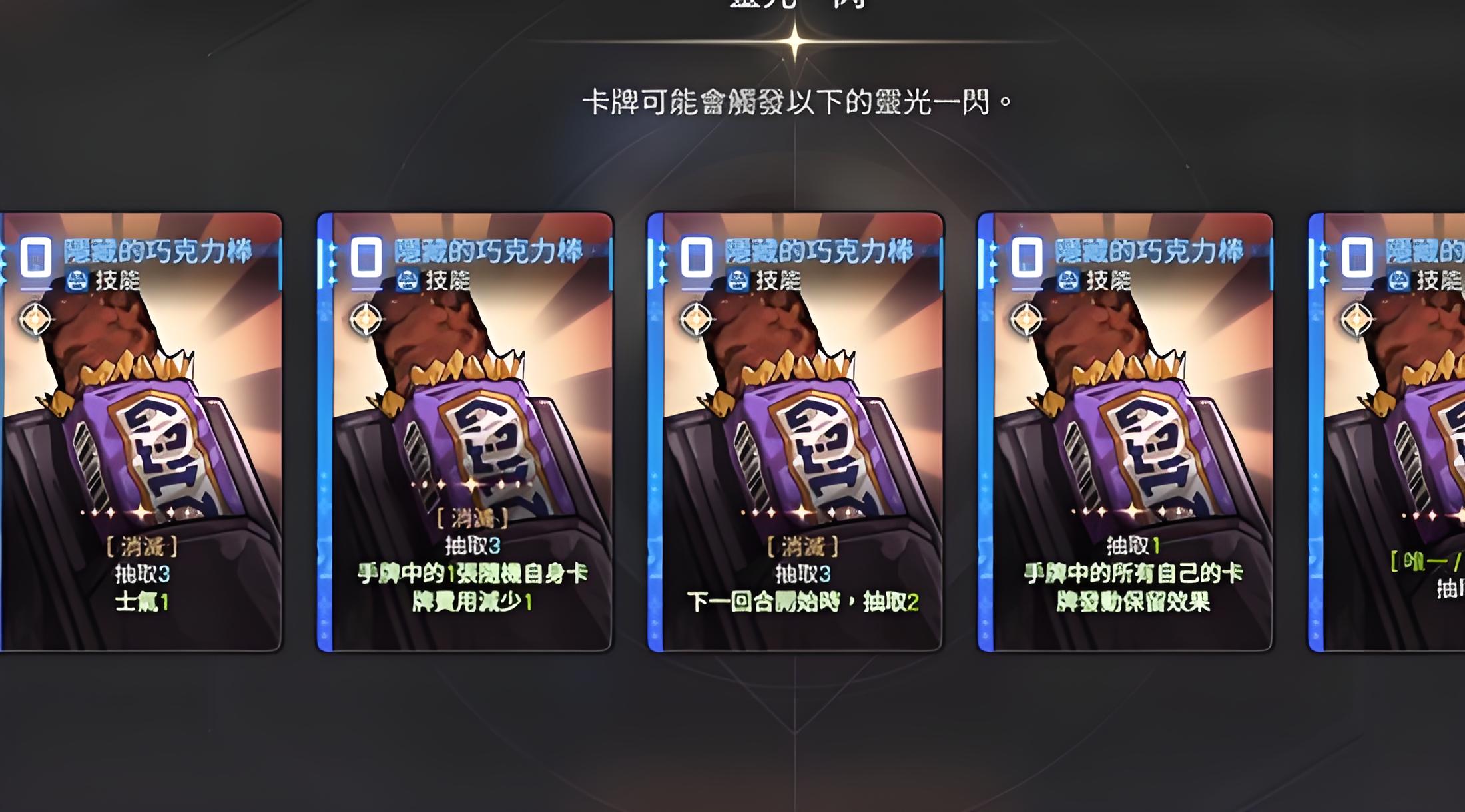 3、隐藏的巧克力棒无行动点消耗属消灭类效果,使用后抽取3张手牌,增强资源调度能力缓解手牌紧张问题不影响主技能节奏。