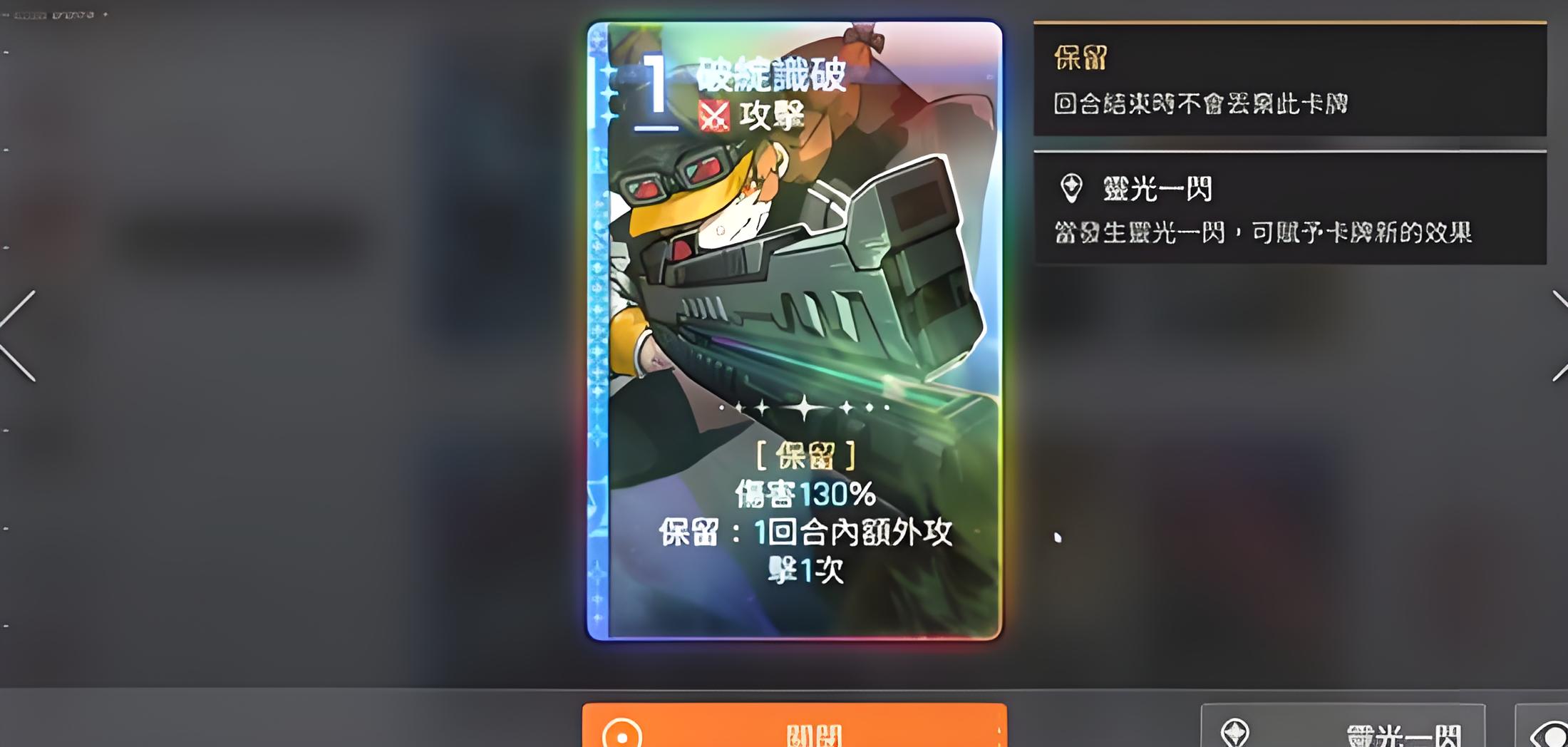 1、破绽识破消耗1点行动点基础伤害120%攻击力,附带保留效果回合结束触发额外攻击,助力衔接高费技能构建爆发链条。