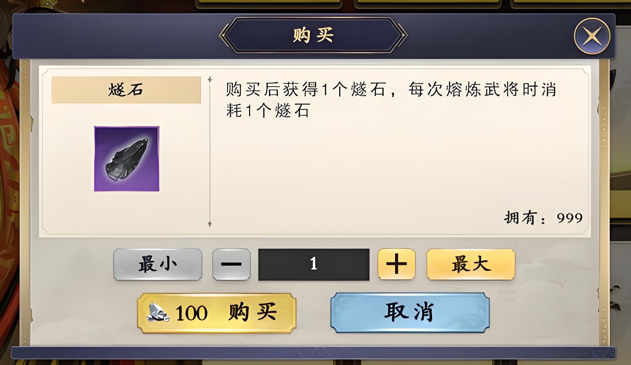4、操作消耗需每次熔炼投入1颗燧石和100银两,燧石可通过游戏商店购买,重置熔炼同样需要消耗燧石。