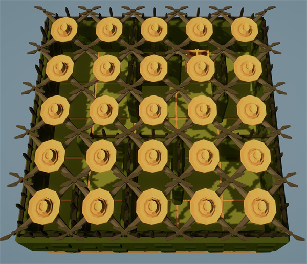 如图,可以用25架无人机铺满5*5的迷宫(也可以铺满2 * 4*4迷宫,这样能用上全部32架无人机效率更高),无论宝箱刷新到哪个位置,都能瞬间采收。重复施加奇怪物质宝箱坐标不动则可确定已经耗尽300轮循环,收获即可。