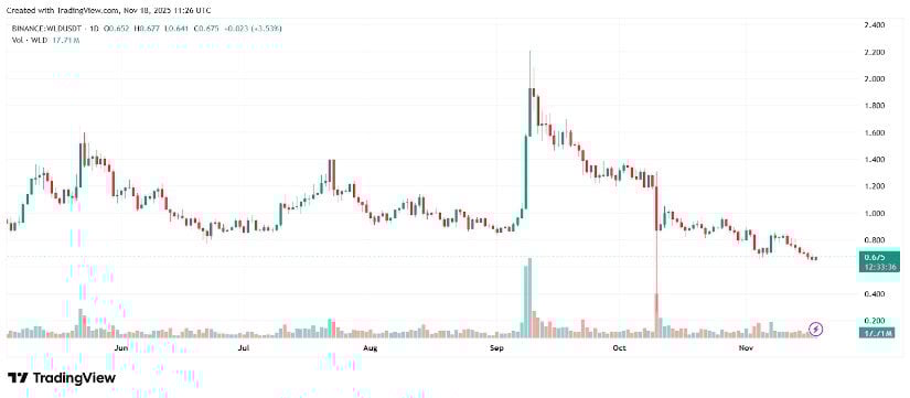 TradingView的WLD/USDT日线图揭示自6月1.80美元高位开始的漫长下跌趋势。经历初夏强势拉升后,该资产于6-8月转入横盘整理区间,波动率下降暗示市场参与者犹豫不决。