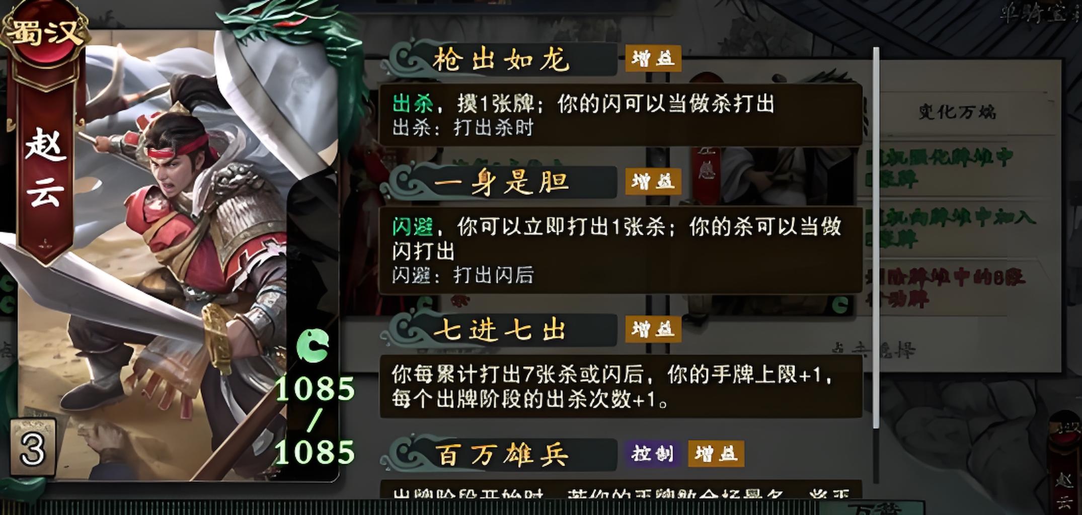 2、赵云可胜任徐州荆州城池战城主,枪出如龙出杀后摸牌且闪能当杀用,以身试胆闪后可反打杀,七进七出累计用牌提升战力。