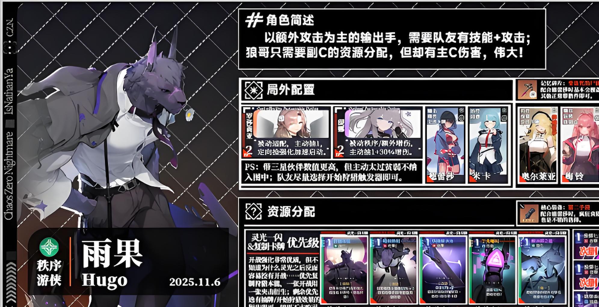 5、搭配需注意细节,三个角色均建议携带抽卡伙伴,只要队友稳定提供触发条件,雨果就能持续打出高额伤害发挥核心作用。