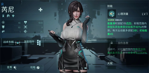 芮妮基础战斗技能是心理测量,当能量值蓄满后,她会主动调配一份药剂,对于射程范围内的所有队友,释放一次治疗,同时,当前仅当队列内存在生命数值,低于其生命百分比40%时,才能够释放。