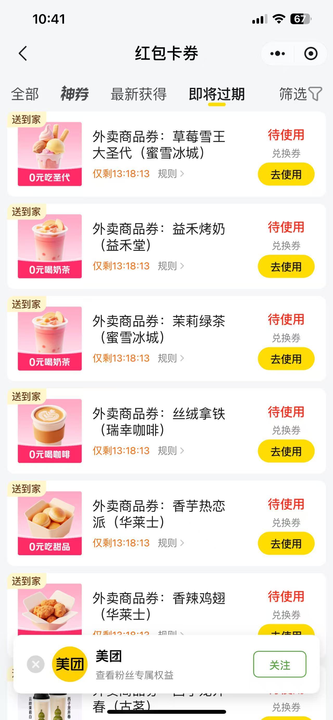 首先打开美团app,接着点击右下角的我的菜单-红包卡券-全部里面就有很多美团赠送的外卖商品券,里面有张瑞幸咖啡:丝绒拿铁(瑞幸咖啡),直接使用外卖就能免费白嫖了。