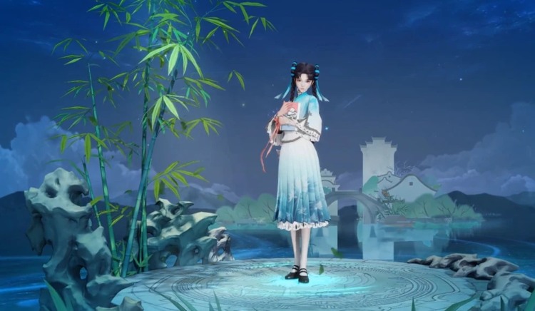 展示动画中,西施怀抱诗集,走到平台上,转身时看到了顺水而行的纸船,背景中有竹子和远处的江南青砖白墙建筑,以及独特的圆拱桥。拥有皮肤可以获得手不释卷个性动作。