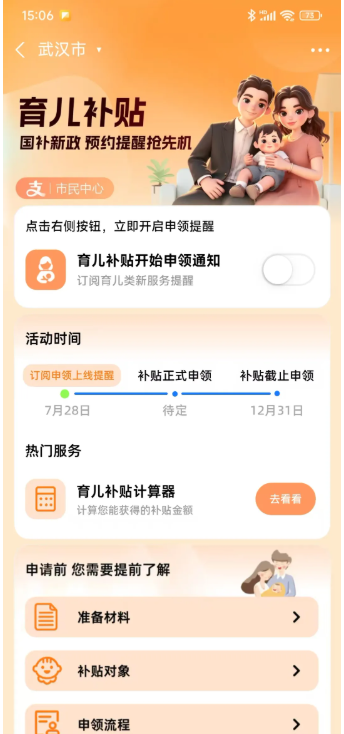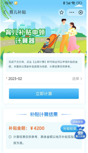 3. 使用【育儿补贴计算器】功能,选择婴幼儿出生时间并点击计算