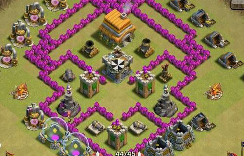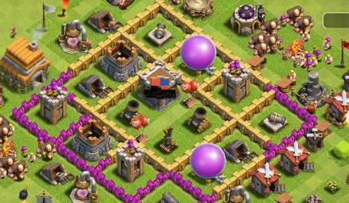 2、格子阵:这个阵营非常适合大部分玩家,因为这套阵营非常的简单,像小编这种懒人就很喜欢这种阵营,但是如果要冲杯和打部落战的话不推荐使用这套。这边大本营我们都不用放里面,直接放外面也没事。不过我们我们需要把圣水罐子和金币罐子放里面。