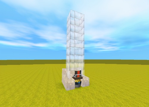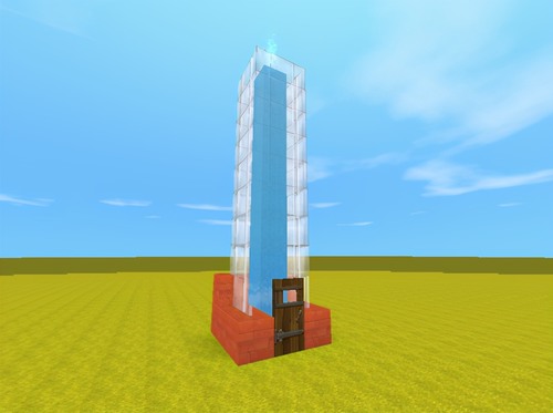 第三部电梯叫水电梯。很多朋友会问水是不是也可以用来做电梯。其实原理很简单。先做一个电梯通道,然后在底部做一个坑,坑里放上硫水晶砂。然后电梯通道灌满水,然后玩家进入电梯,因为底部的硫水晶砂喷出的气体可以送玩家快速上升。