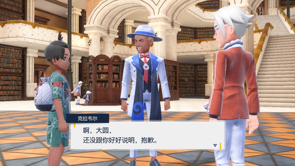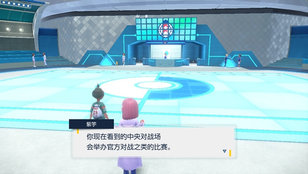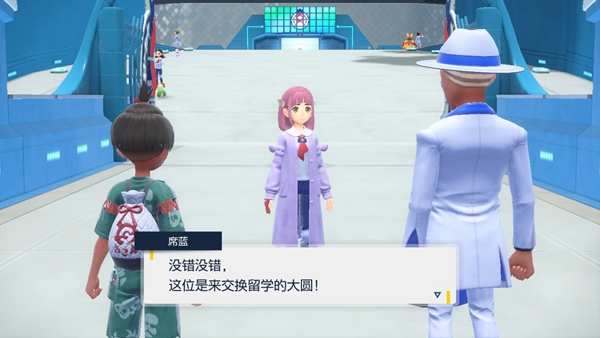 之后有3个问题可以问,随便选择一个后,就会出现一个新NPC出来回答,这个人叫做紫芋,席蓝校长委托紫芋来为我们介绍蓝莓学园,之后一个人往前走会触发剧情,还透露了一个重要信息,野生的宝可梦会太晶化。