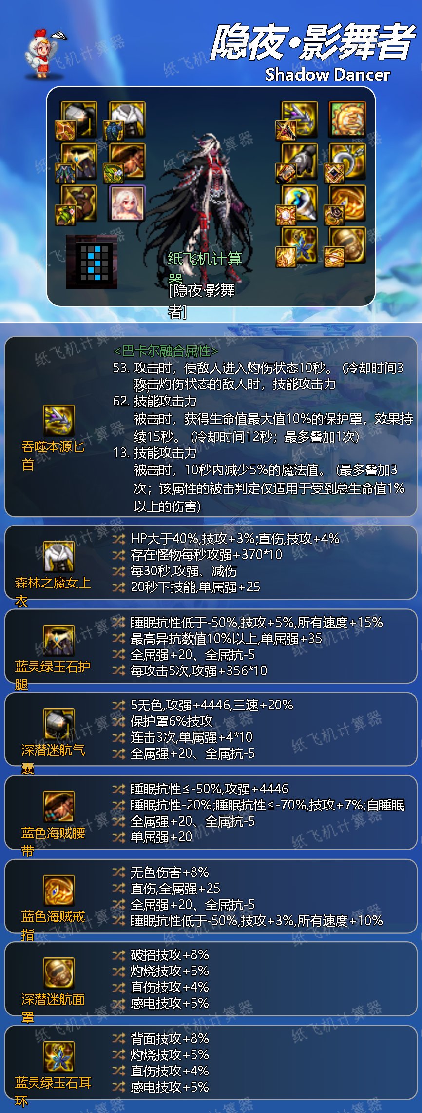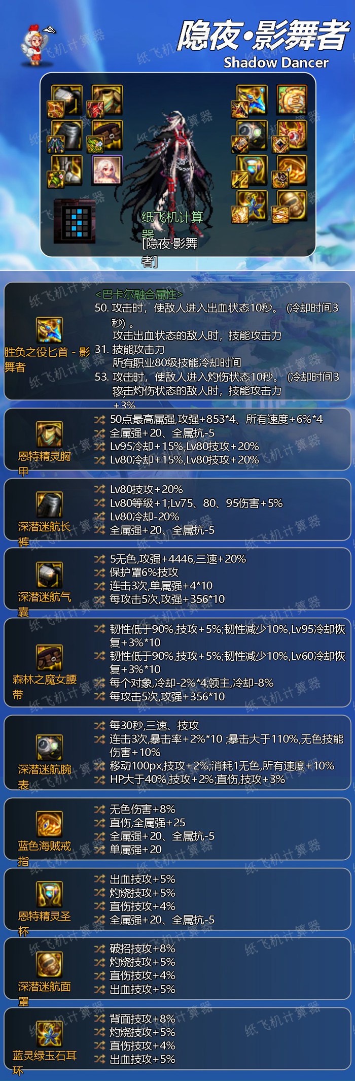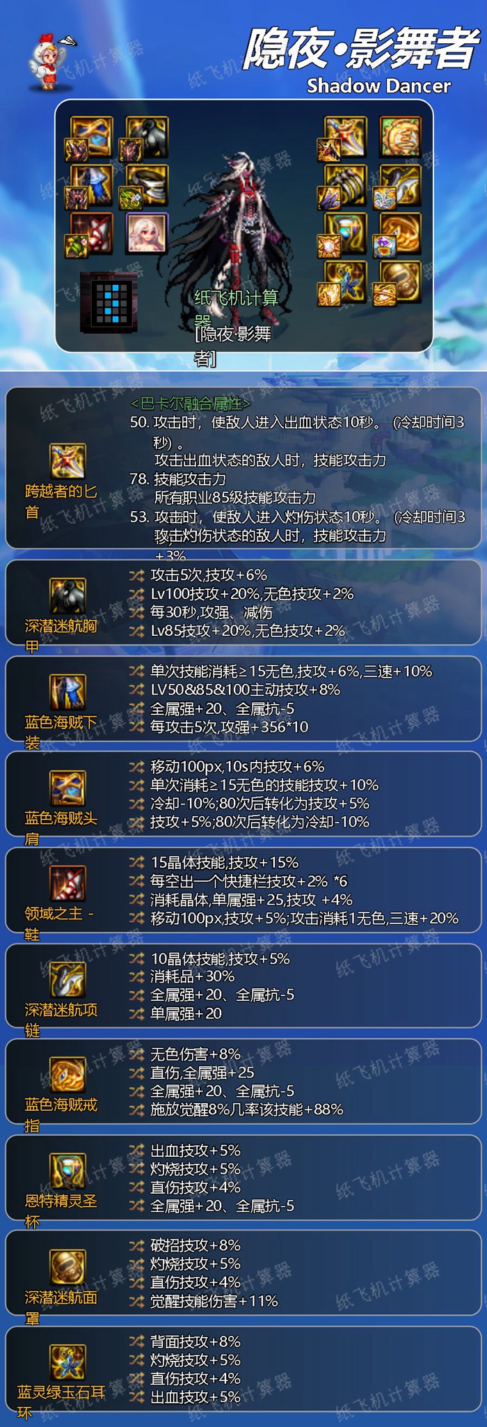 适合土豪级影舞者玩家。是神界版本的伤害天花板,对自定义装备需求量极大,强烈建议使用传说鞋但需花费巨额金币。核心部位为鞋子。