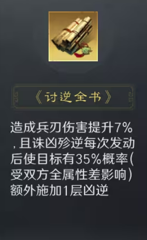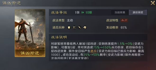 其核心机制围绕【凶逆】状态展开:战法发动后,锁定敌方统率最低的两名目标,持续叠加层数;叠满3回合后(若携带《讨逆全书》可压缩至2回合),使目标受到伤害提升至少15%,该增伤效果全程生效。该设计直击敌方低统主力输出或辅助单位,有效绕过高统率武将的减伤屏障,对传统高减伤肉盾阵容亦有显著穿透效果,大幅缓解兵刃系打不动坦的长期痛点。