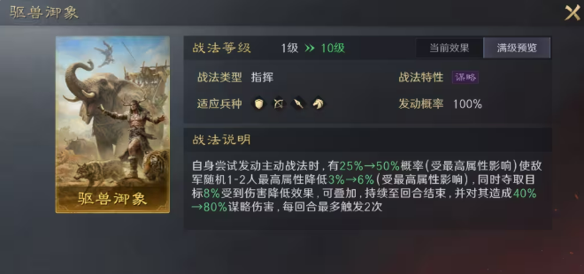 其战法含三重效果:随机选取一至两名敌方目标,降低其最高属性6%(可叠加);同时夺取目标8%减伤效果转移至己方,相当于同步施加8%易伤并提升自身减伤;另附带一段谋略伤害,用于破除抵御。单回合理论最高可对两名目标各触发两次,合计达成双目标16%易伤+己方32%减伤。触发判定仅需“尝试发动主动战法”,无需成功发动,且属性降低可联动孟获【借刀】机制。