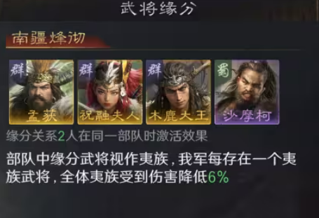 缘分方面,两人即可激活基础效果;三名夷族武将同队时,提供全体常驻18%减伤,相当于额外获得一个曹操级减伤量;金书解锁后,还可同步获取兵力回复效果,形成全面防御支撑。推荐阵容采用木鹿大王全先攻加雁型阵,协同孟获【借刀】与祝融夫人兵刃输出;南疆烽烟激活后,18%减伤叠加巫医古卷治疗,队伍生存与续航能力显著增强。此配置亦可释放诸葛亮,使其灵活调配至其他主力队伍,提升多队作战的策略弹性。