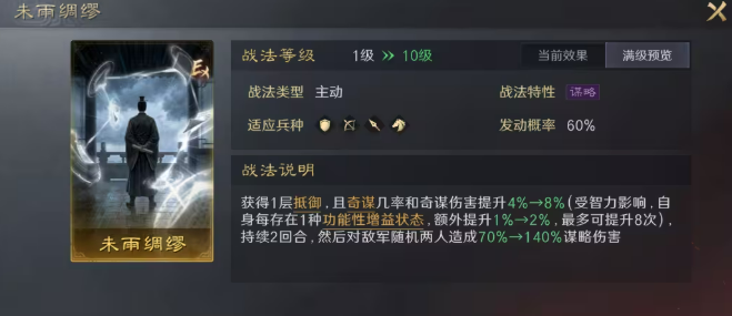 【未雨绸缪】专为高智力谋略型武将设计,发动即赋予一层抵御,并同步提升奇谋发动概率与奇谋伤害。其增益幅度随自身功能性状态数量线性提升,清醒、必中、破御、抵御等均计入统计。与司马懿协同效果最优:布阵叠满8层后,仅保底即可获得24%奇谋概率与奇谋伤害提升,叠加智力加成后综合收益极为突出。