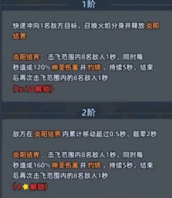炽焰舞姬的二技能有三个阶级,效果会逐步增强。使用技能时,她会快速冲向敌人并召唤一个火焰分身,展开一个炎阳结界。结界会击飞范围内的八名敌人,使其失去控制1秒,并且每秒对结界内的敌人造成120%的伤害,持续5秒的灼烧效果结束后,还有概率再次触发一次击飞。