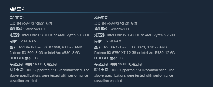 最低配置要求如下:操作系统需为Windows 10;处理器建议Intel Core i5-6600K或AMD Ryzen 5 1500X;内存不低于8GB RAM。在此基础上可实现低画质稳定运行。若追求更高帧率与画质表现,推荐升级至更高端CPU与16GB及以上内存。需特别注意——本作对存储设备读写性能敏感,使用机械硬盘易引发场景加载延迟或瞬时卡顿,强烈建议搭配SSD固态硬盘部署。
