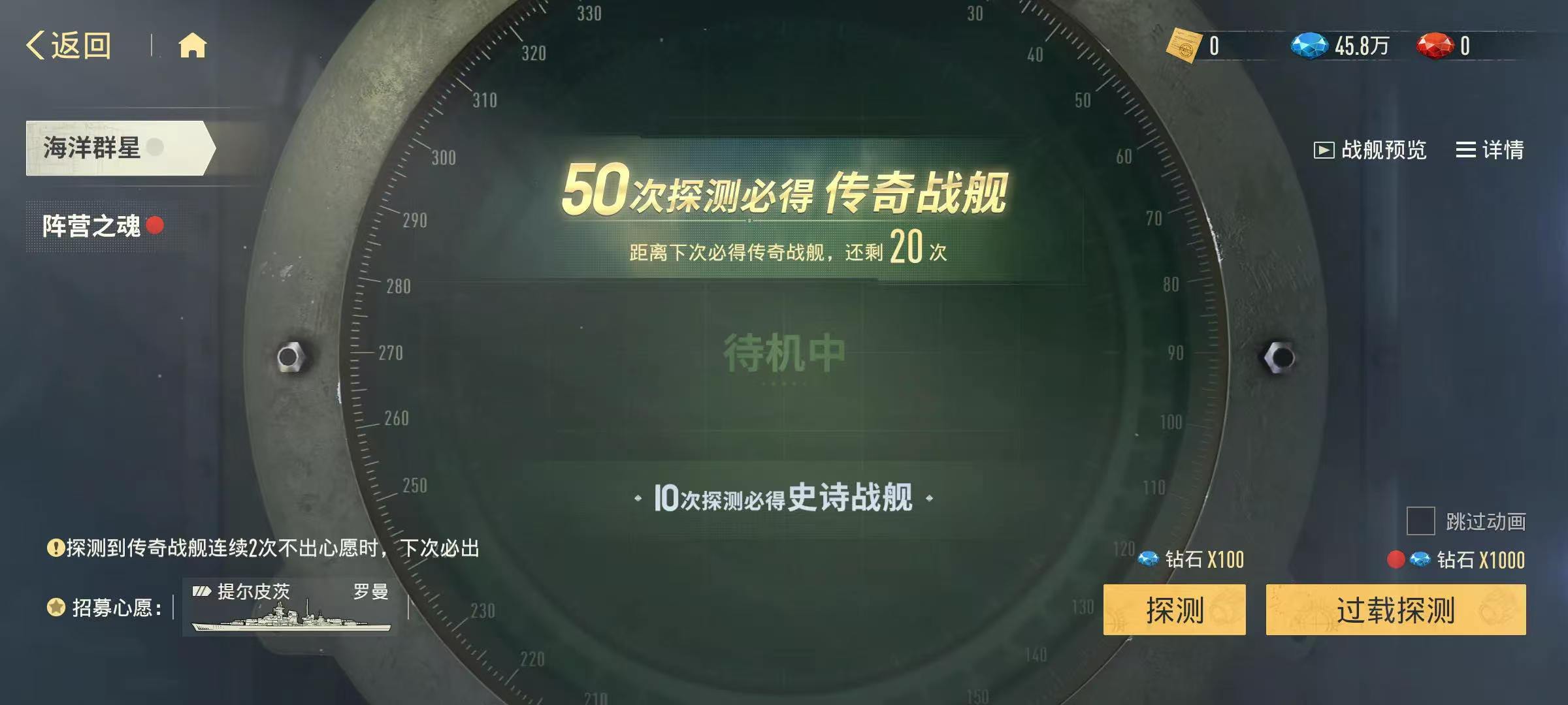 游戏的核心战斗围绕舰队编成展开,战舰个体强度与协同配置直接决定关卡通关效率与PVP胜率。因此,获取高阶战舰是玩家前期最关注的成长节点。目前战舰主要通过“探测”系统获取——该系统设有多个独立卡池,分别对应通用型“舰队密函”、阵营限定型“阵营密函”,以及可直接使用的“蓝钻”(单价100点/次)。其中,单次探测有概率获得完整战舰或其碎片;累计10次探测必定获得至少一艘史诗品质战舰;累计50次探测则确保产出传奇品质战舰。蓝钻与各类密函既可通过充值获得,也可通过主线推进、日常签到、成就达成等常规途径稳定积累。
