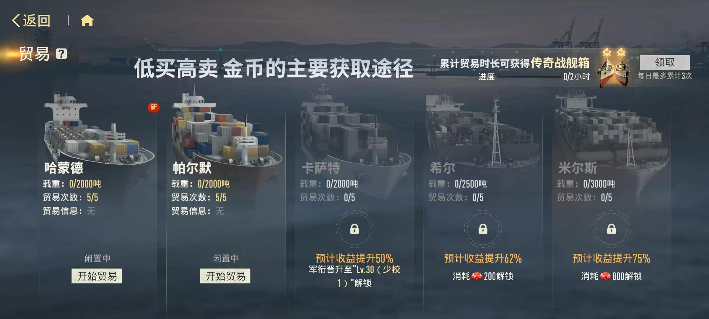 除战舰本体外,游戏内另一类关键消耗资源为“金币”与“锰钢”。金币用于战舰升级、升星、技能觉醒及炮组解锁;锰钢则是战舰后期突破阶段的刚性材料。二者均可通过“远洋贸易”玩法长期稳定产出:该模式模拟海上商业运营逻辑,玩家通过配置货轮航线、管理供需关系、应对随机事件等方式,逐步扩大收益规模,最终实现资源自给。该设计显著降低了零氪或微氪玩家的养成门槛,使战力成长更依赖策略理解与时间投入。