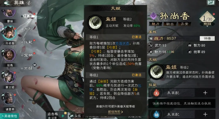 孙尚香是吴国典型的负面状态驱动型爆发输出。其天赋“弓意蓄势”规定:敌方每拥有一种负面状态,孙尚香获得1层弓意,每层提供5%暴击率加成,最高3层。使用技能造成伤害后,有60%概率与目标比拼武力:胜利则重放一次技能,失败则降低目标5点武力,持续2回合。追击技能优先锁定敌方负面状态数量最多的单位,造成150%伤害;觉醒后可对敌方全体造成238%伤害,若触发暴击,则额外追加78%伤害,兼具精准打击与群体清场能力。