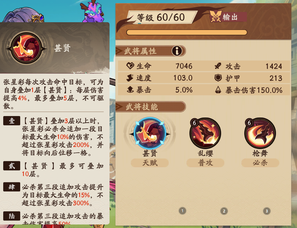 张星彩初始即拥有150%暴击伤害加成,定位为前排近战输出角色。其技能机制聚焦于单目标连续压制,所有攻击均锁定敌方前排单位。该特性使其在面对纯坦克或前排+后排法师组合时存在破阵压力,需搭配合理阵容弥补打击面局限。