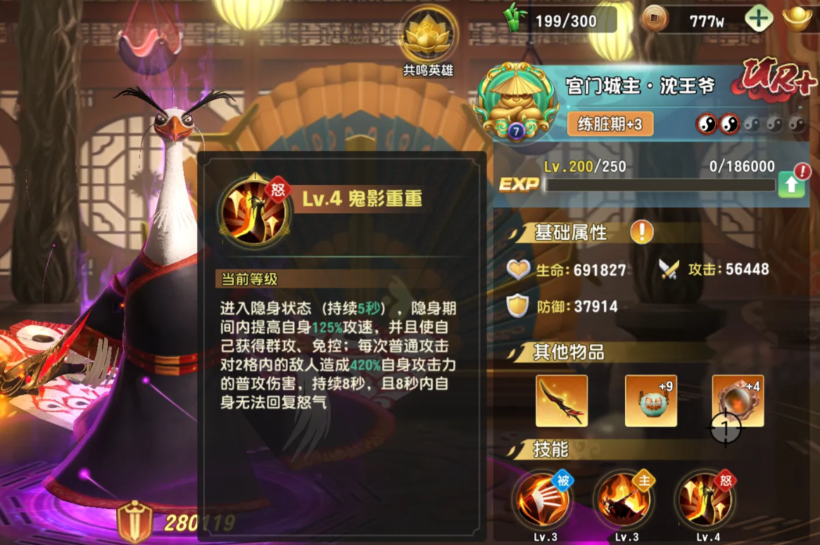 该卡为当前版本唯一UR+品质沈王爷,定位为高机动性刺客型主C。绝学属性为木系与金系,技能设计强调瞬时爆发与战术规避能力。核心怒气技“鬼影重重”可触发5秒隐身,并将普攻转化为范围攻击——每次命中对范围内两名敌人造成429%攻击力的伤害。此机制使其在面对依赖锁定追击的敌方单位时具备显著生存优势。但需注意:技能持续期间无法恢复怒气,因此更适合在敌方减员关键期或残血收割阶段释放,而非持续站桩输出。