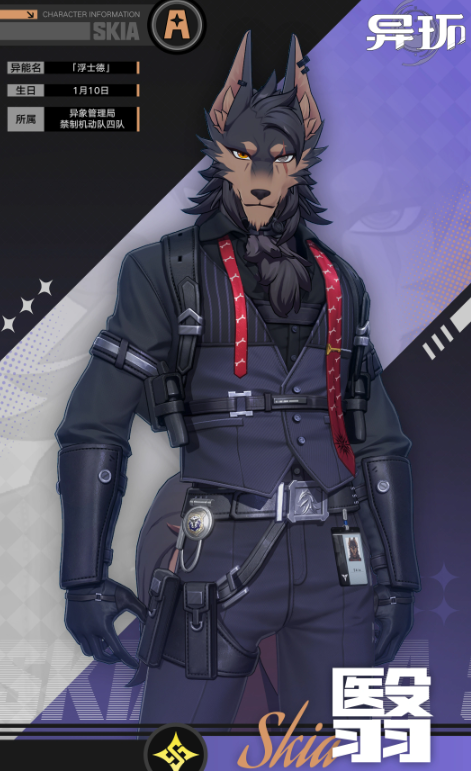 翳为狼首造型的相属性高机动型角色,机制围绕“影子”与“兽牙影刺”展开。普攻共五段格斗连击,每次命中敌方单位,均会从自身影子中分裂出一枚“兽牙影刺”进行追击。“潜影追踪”使其跃入影子,造成六段范围相属性异能伤害;本轮命中每个目标,将额外分裂三枚影刺进行锁定追击,同时进入“潜影状态”——该状态下可在地面或垂直墙面自由移动,且不被敌人察觉;部分类型攻击可被免疫;当角色主动接触已被影刺标记的目标时,将触发额外协同攻击。“缉令”以警犬指令形式发动,驱使影子撕咬目标,造成一次范围相属性输出。终结技投掷旋转打火机,引发影子向全图扩散,造成首次相属性范围伤害;随后多重黑影汇聚至单一坐标,连续发动三次相属性范围打击。释放该技能后,“兽牙影刺”的基础伤害提升,并对目标附加控制效果。