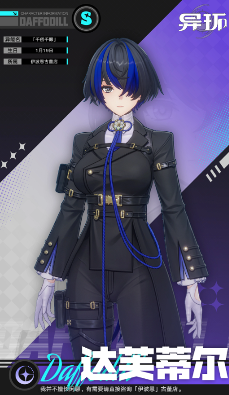 达芙蒂尔为暗属性异能输出角色,普攻为五段双刃斩击,附带暗属性异能伤害;长按普攻将向前突进,发动旋风急斩并留下持续伤害印痕。“同振”技能对单体目标造成暗属性伤害,全队角色使用援护技时可为其叠加层数,每层提升伤害与“倾陷值”;叠满两层后,技能形态升级为绳索缠绕+太刀斩击,伤害类型仍为暗属性。“交刃”为单体暗属性异能伤害技能。“见此终幕”释放后造成范围暗属性异能伤害,随即解放左眼,在技能持续期间提升自身全伤害,并对范围内所有敌人施加“洞察”状态。