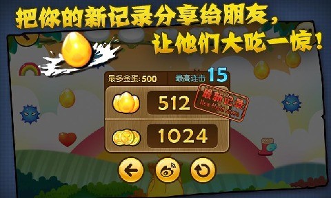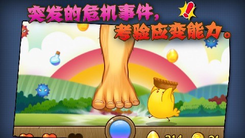 1.反应力大挑战:不断掉落的物体里,有金蛋、有减分的红蓝刺球、有加能量的宝瓶、有讨厌的巨人大脚、有惊喜的彩虹……小朋友需要集中精神迅速反应,才能得到更多的金币。