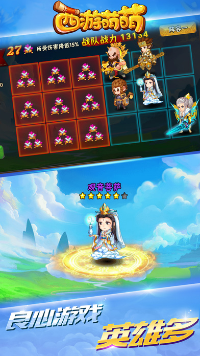 5、在游戏的阵型调整中,玩家可根据不同情境来预设不同阵型,十分方便战斗时切换和操作。如副本阵型、决战进攻阵型、决战防御阵型等等,每个阵型中最多可上阵五名英雄。特别值得一提的是,由于《西游萌萌》在英雄系统上为玩家打造了数百神佛形象,且各有特色,这令让玩家在阵型排列上可以拥有超多选择,既避免了重复单调,也完全体现出玩家运筹帷幄的能力
