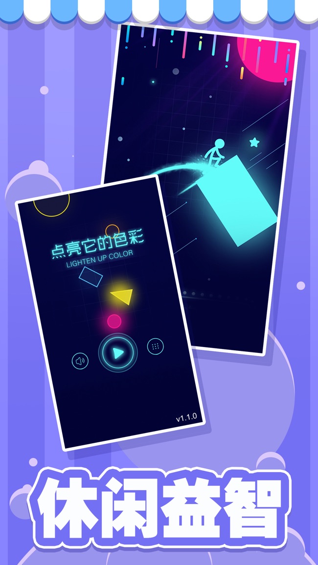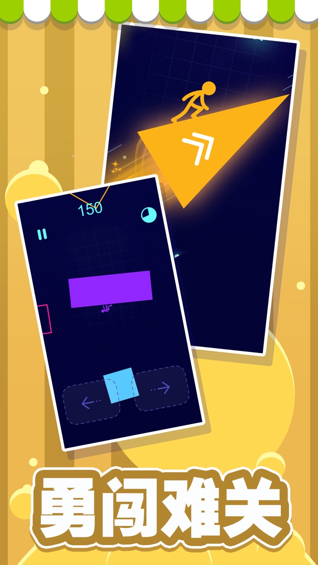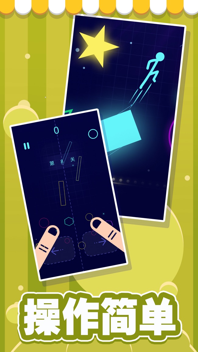 游戏以火柴人为主角。在漆黑的夜空中,散发出耀眼光芒的火柴人,需要勇敢不断地翻转跳跃,将移动的几何霓虹灯色彩点亮,照耀黑色的星空。越到后面游戏的难度会越高,火柴人如果停止跳跃,霓虹灯会逐渐往下沉降,世界又会陷入到一阵黑暗中。这是一款非常考验反应力的魔性手游,快来帮助火柴人一起点亮黑夜中的色彩,带给世界光明。