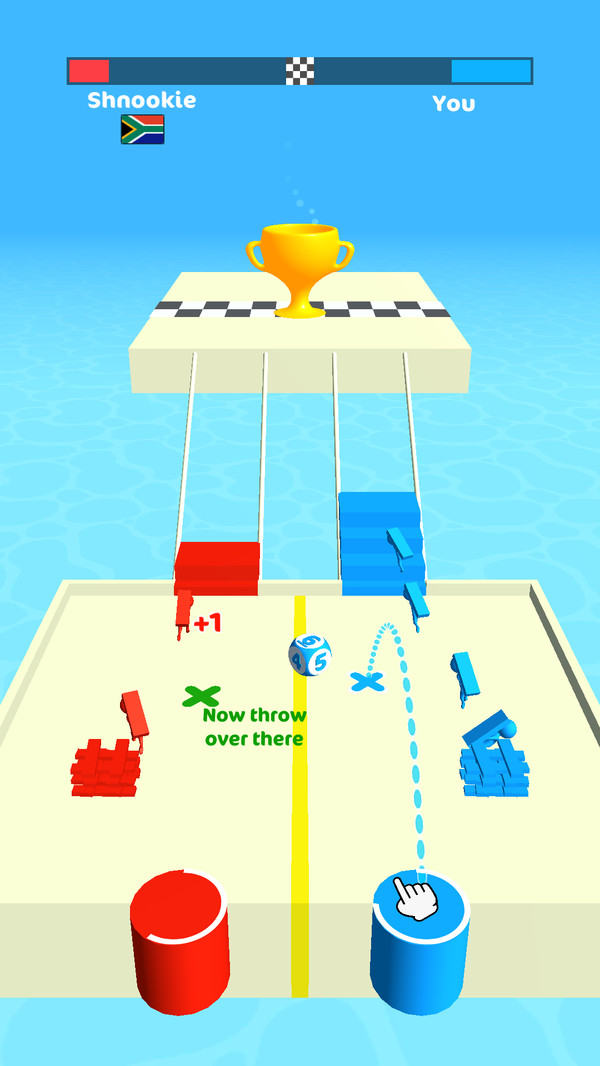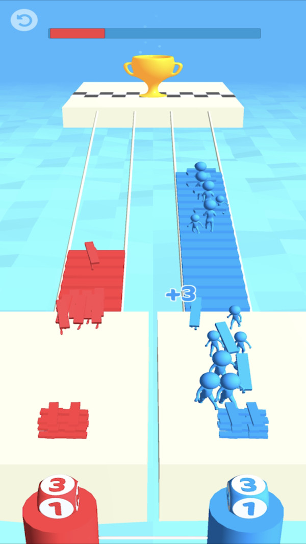 在游戏中你需要不断收集木板,收集木板可以帮助你搭建更多的桥梁,从而可以抄近路,让自己率先到达终点,成为整个赛跑中的冠军,只有赢得了第一名,才能进入下一个关卡,千万不要让自己掉进水中哦,否则就会闯关失败