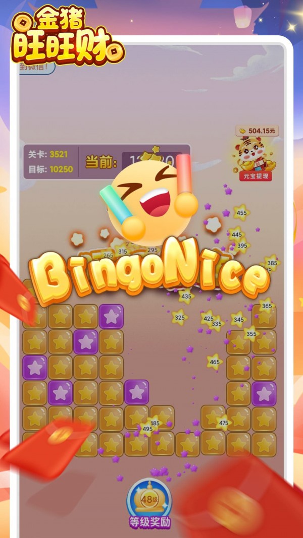 金猪旺旺财作为一款让人欲罢不能的休闲消除闯关领红包手游。在这个金猪旺旺财游戏中,在游戏里玩家将进入一个充满着金猪和财富的世界,通过消除相同的图案来开启金猪旺旺财中的宝藏,赢取丰厚的红包奖励。金猪旺旺财游戏以其精美的画面、简单易懂的玩法和丰富多样的关卡设计而备受用户喜爱。