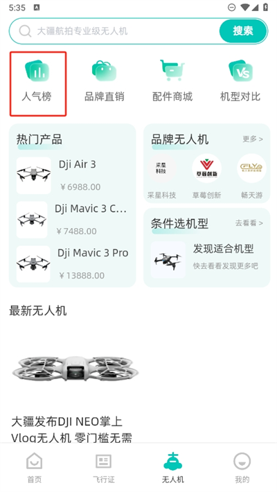 2、想要了解更多有关无人机的用户,直接前往无人机这个栏目中查询有人气榜、品牌直销和配件商城等;