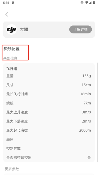 5、随机点击一个无人机型号进入后,就能看到有关该无人机的一些参数配置和基础信息等。