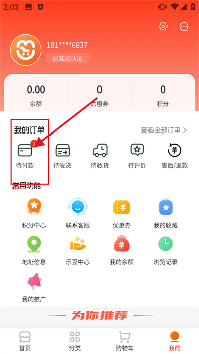 5、紧接着,能在【待付款】当中看到订单数量,如果还未付款会在这里显示,如下图所示;