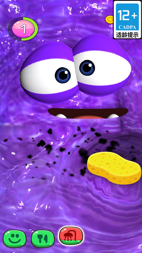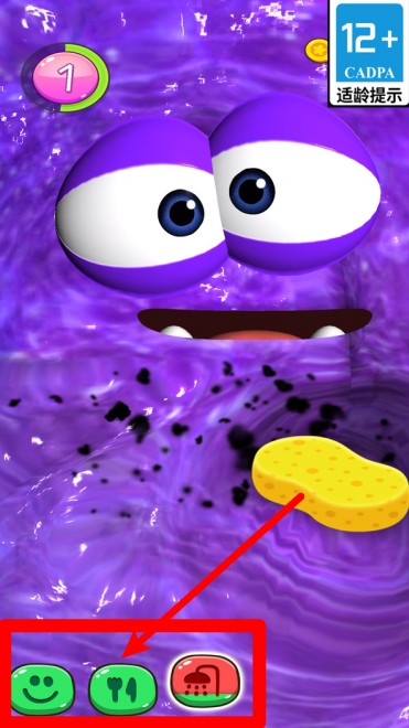 3.底部功能键代表不同护理选项,当前为清洁状态,用海绵将史莱姆上的污渍彻底擦除。