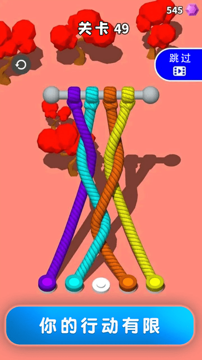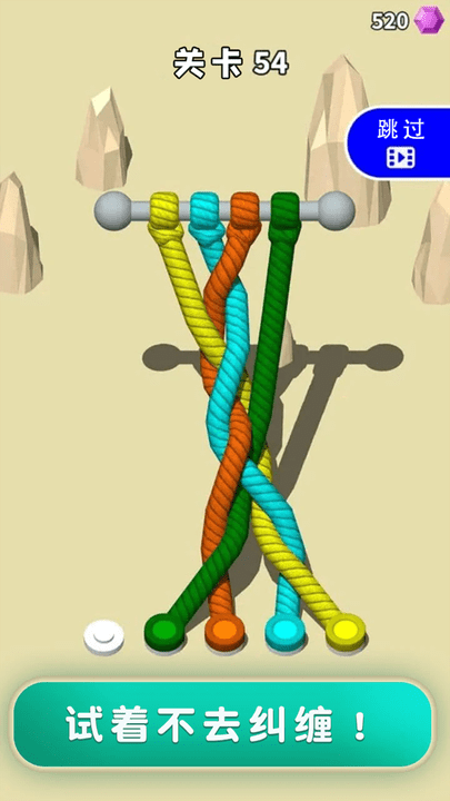 1、核心目标是解开所有缠绕的绳索,为每条彩绳找到独立路径。看似简单的任务需要综合考虑空间布局和移动顺序。