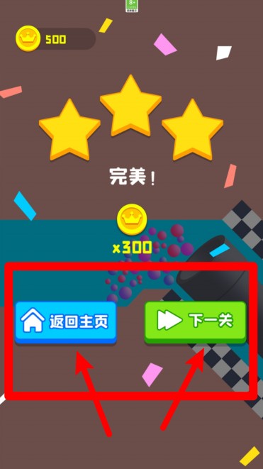 3.通关后将获得评分与金币奖励,点击“返回主页”可退出关卡,也能选择“下一关”继续挑战新赛道。