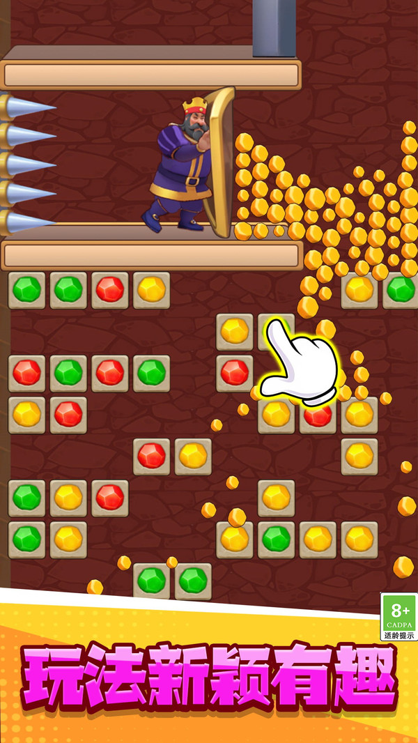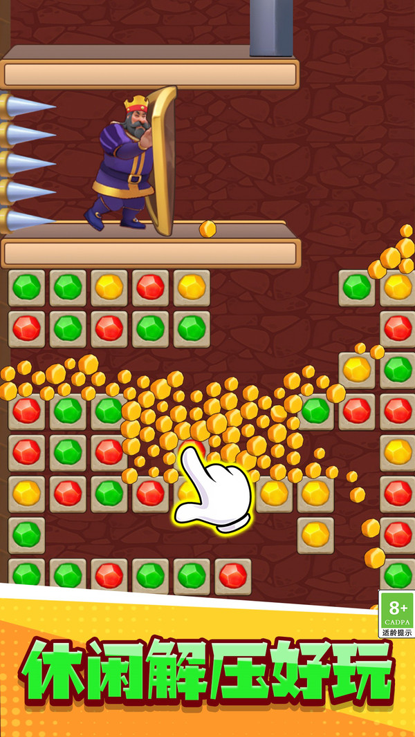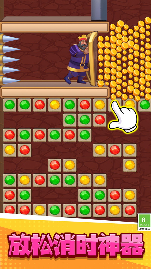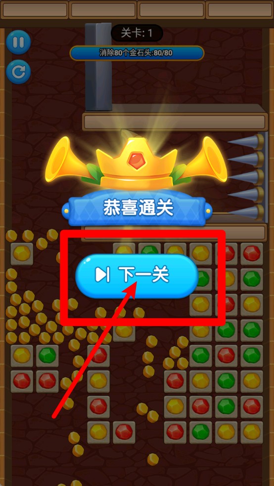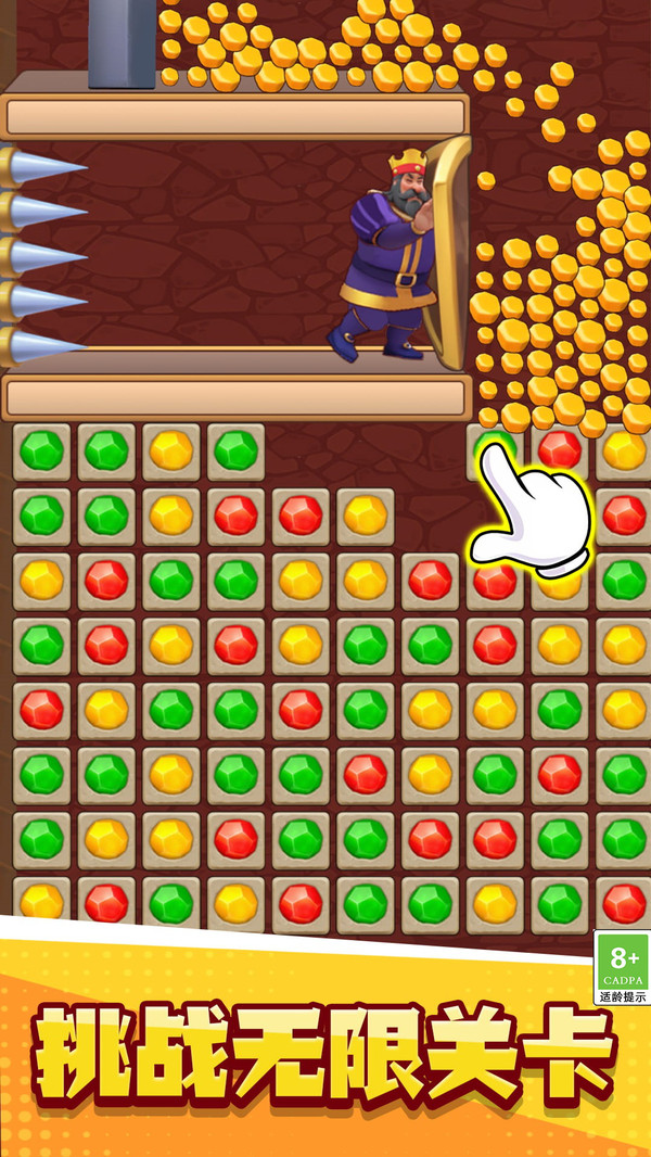 2.点击相同颜色的宝石图案进行消除,集满指定数量金石头后可打通道路释放金币完成当前任务目标。