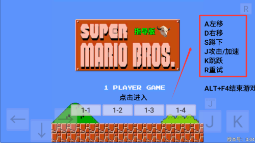 1、玩家通过A/D键控制左右移动,S键下蹲,J键进行攻击或加速,K键跳跃,R键重试,ALT+F4可退出游戏。