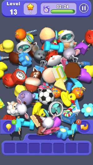 1、玩家需要在杂乱的3D物体堆中仔细观察,找出三个完全相同的物体进行匹配消除,逐步完成关卡目标。