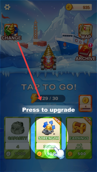 3、返回主界面,点击【STRENGTH】等升级项(如500金币提升),强化挖矿机属性(容量、强度、收益),提升挖矿效率,解锁更深层资源。