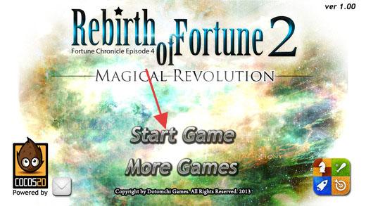 1、游戏启动界面,显示“Rebirth of Fortune2”“MAGICAL REVOLUTION”,点击“Start Game”开始游戏,还有“More Games”选项。