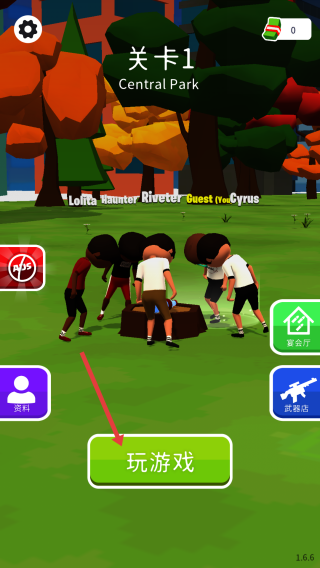 1、关卡1(Central Park)界面,点击“玩游戏”,加入匹配,与其他玩家(如Lolita、Haunter)组队/对战。
